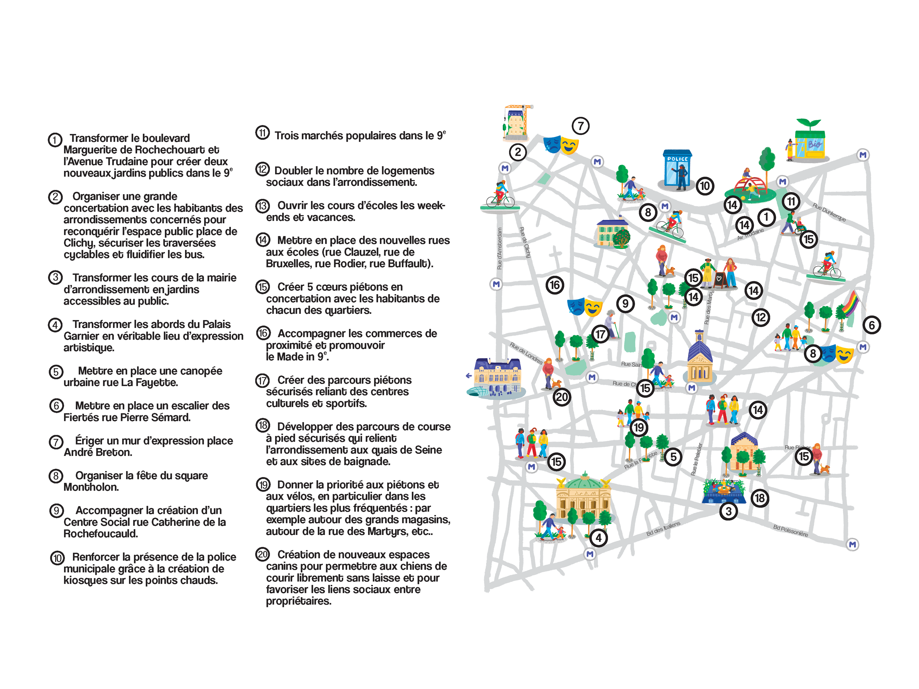 La tranquillité publique est une condition du bien vivre. Nous défendons une police municipale de proximité (îlotage, rondes régulières, présence nocturne à Pigalle), un éclairage public mieux adapté, et des règles lisibles sur les terrasses : prévention, puis sanction graduée en cas de non-respect. Nous renforcerons l’aide aux victimes avec des permanences en mairie et un « aller-vers » via des lieux-relais du quotidien. Contre les incivilités et le bruit, nous soutenons des équipes dédiées de la police municipale et l’équipement en sonomètres, ainsi que des alternatives à la sanction (stages de réparation pour dépôts sauvages, mégots, tags). Sur la propreté, nous voulons un pilotage transparent : meilleure traçabilité des signalements via « Dans Ma Rue », indicateurs publics par quartier, concertations rue par rue sur les points noirs. Une campagne « veillons les uns sur les autres » informera et mobilisera sans stigmatiser. Rester et bien vivre dans le 9ᵉ, c’est retrouver la maîtrise du logement, renforcer l’école et la solidarité, soutenir les commerces, verdir l’espace public et garantir une ville propre et apaisée. Notre programme met l’action locale au service de l’accessibilité et de la qualité de vie.