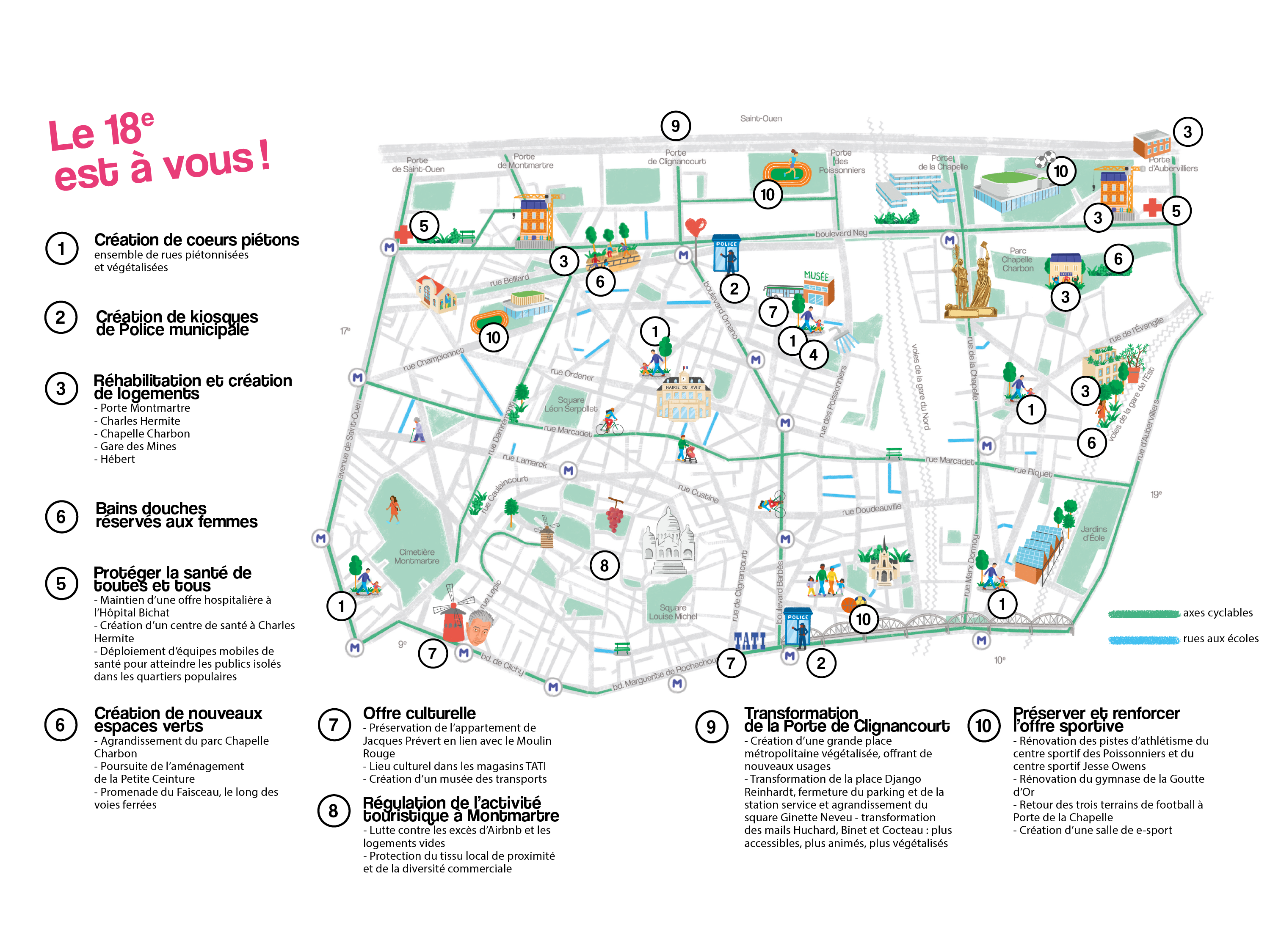 Nous continuerons de transformer le 18ᵉ, tant au travers de grands projets comme (l’embellissement de) la Porte de Clignancourt, qu’au coin de nos rues en créant des cœurs piétons végétalisés à Jules Joffrin par exemple. Nous créerons de grands espaces verts, comme avec le parc Paris Nord-Est ou la promenade du faisceau.