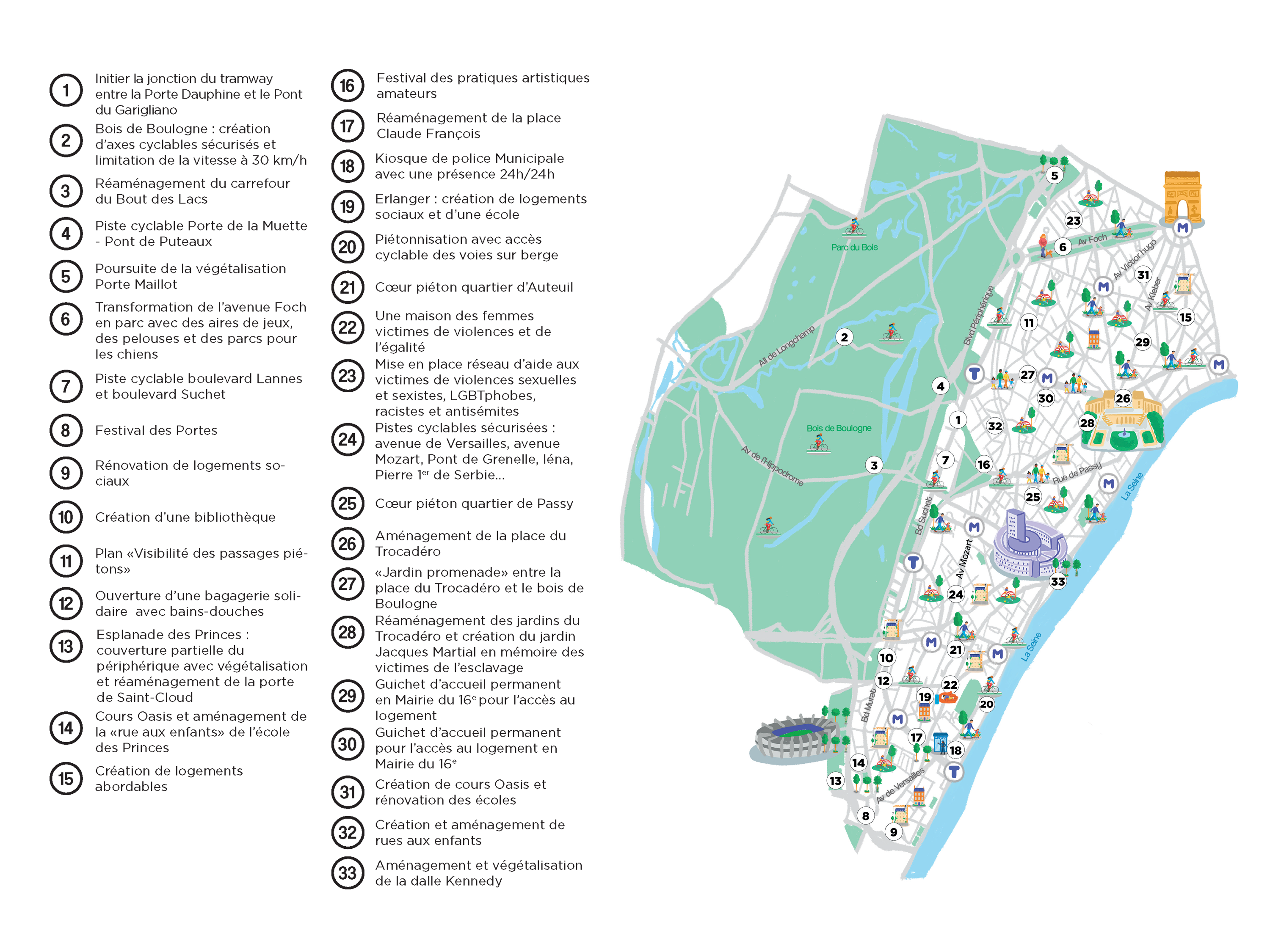 - Des espaces publics partagés dans nos quartiers apaisés et protégés - Piétonisation et végétalisation de rues dans chaque quartier - Brigades anti-incivilités pour la propreté et la prévention du harcèlement de rue